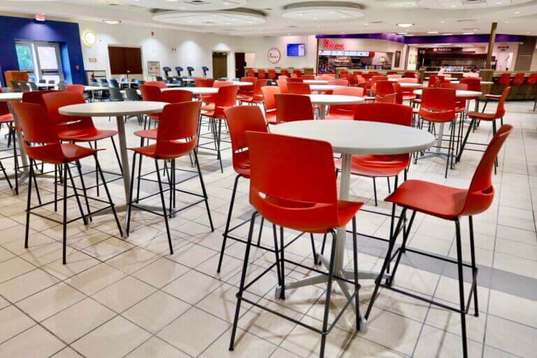 - Cafeteria: The dining area boasts Global Bridges tables, Global Venture booths paired with Swap tables, offering both communal and private seating options for students to relax and recharge.