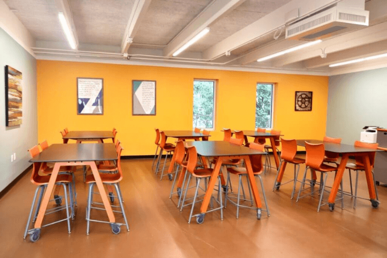 - Architecture & Construction Classrooms: These specialized classrooms feature KI Stout Tables with butcher block tops, paired with Via Splash Air chairs. This setup is designed to support the hands-on learning required in these fields, combining durability with comfort.